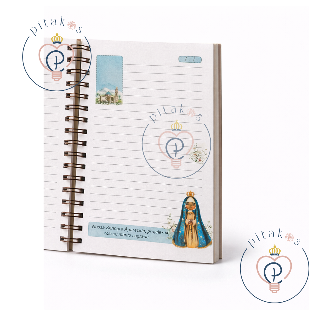 Com capa exclusiva inspirada em Nossa Senhora Aparecida, este modelo traz uma estética delicada e atemporal, ideal para estudos, anotações, catequese, registros pessoais ou rotina espiritual.